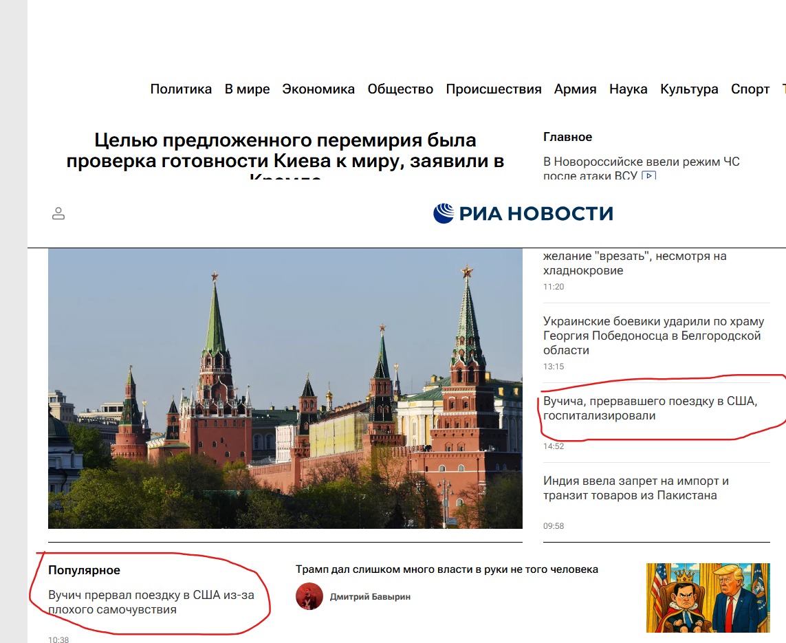 Agjencia ruse RIA Novosti shkroi gjithashtu për Vuçiçin dhe “sëmundjen” e tij të papritur, e cila madje paraqiti në faqen e parë dy lajme që lidheshin me Vuçiçin dhe kthimin e tij të papritur nga SHBA-të “sepse u sëmur”.