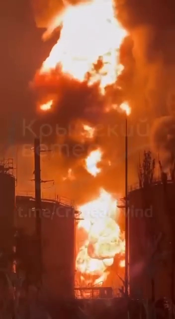 Imazh në mediat sociale ruse i ribotuar të hënën nga platforma ukrainase e informacionit Krymsky Veter, që tregon një zjarr që digjet në fermën e rezervuarëve të karburantit Feodosia.