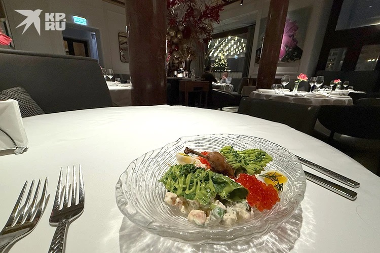 Pjata e parë ishte sallata Stolichny, një recetë e vitit 1961. Është një version “fisnik” i sallatës Olivier me havjar të kuq dhe thëllëzë. Mjaft e ngopur, pikante dhe e kripur. 1.500 rubla.