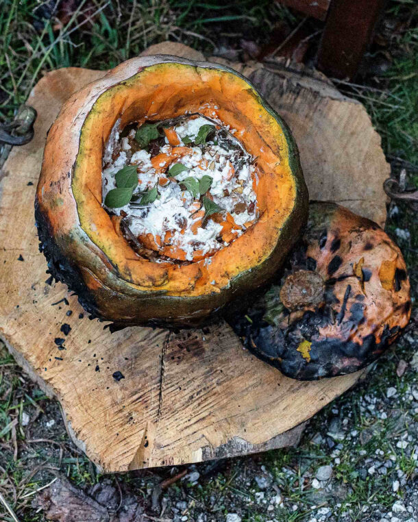 Për një pjatë kryesore mbresëlënëse, vegjetariane, pjekim një kungull të tërë, të mbushur me djathë dhie, rrush të thatë dhe arra.