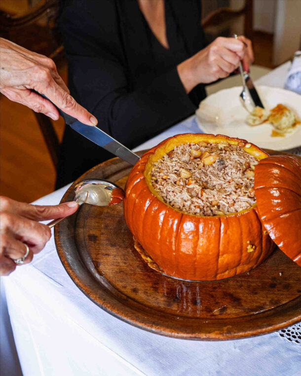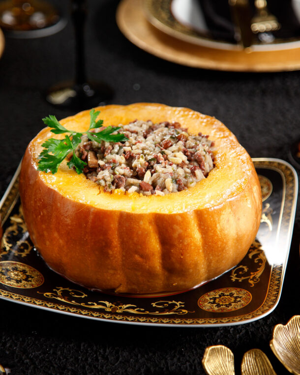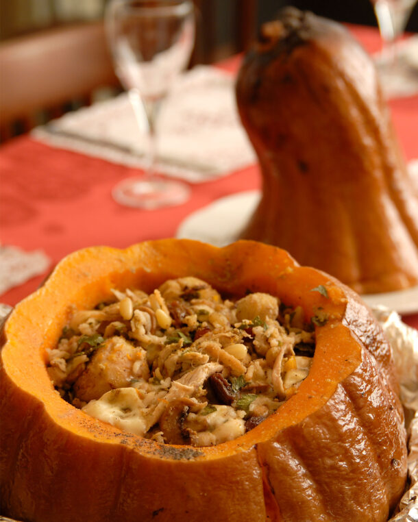 Një kungull i tërë i pjekur dhe i mbushur me të gjitha llojet e përbërësve, nga orizi dhe mishi i grirë deri te mëlçia dhe gështenjat, mund të zëvendësojë edhe gjelin e detit.