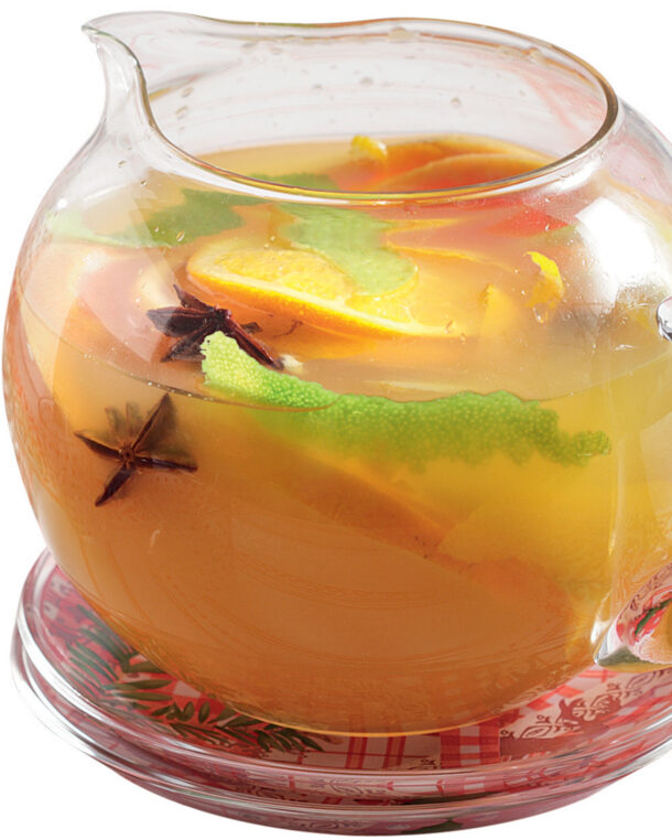 - Hidheni pijen e nxehtë në një tas të madh qelqi për servirje ose në një enë ose brokë vere dhe shtoni fetat e agrumeve.