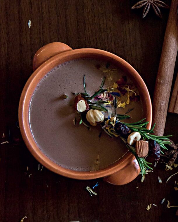 - Dekorojeni me rozmarinë, arra dhe rrush të thatë. Shërbejeni koktejin të ngrohtë.