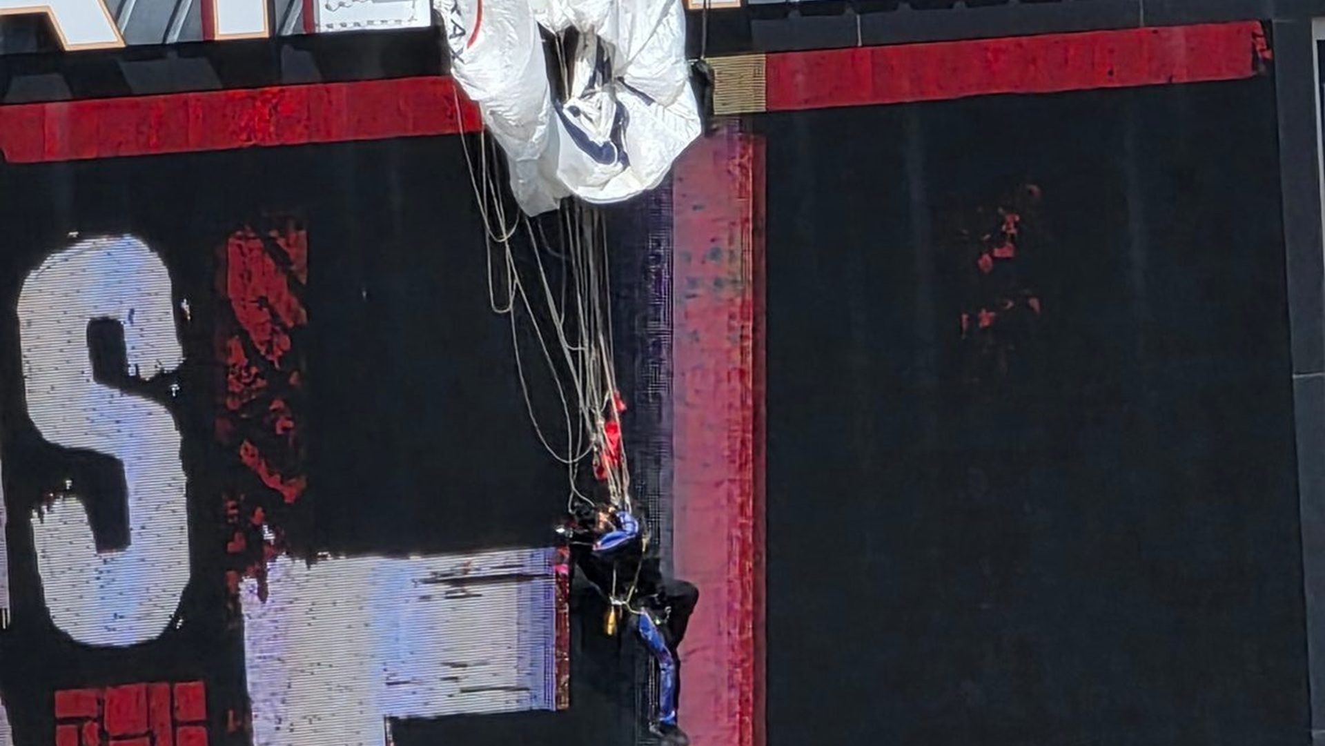 Tifozët e panë me ankth ndërsa parashutisti, emri i të cilit nuk u bë i ditur menjëherë, qëndroi në ajër për 15 deri në 20 minuta përpara se ekipet e emergjencës të përdornin një shkallë ajrore për ta transportuar në një vend të sigurt.