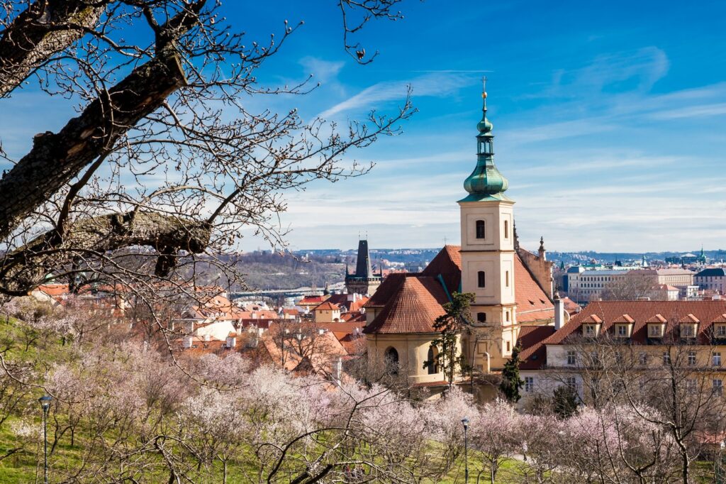 Kopshtet Petřín në Pragë janë veçanërisht magjike në pranverë, kur pemët çelin dhe qyteti shihet nga një perspektivë krejtësisht e ndryshme.